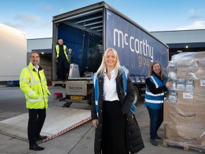 Caroline Platt, MD of Platts Group with (L/R) McCarthy Group’s MD Mike McCarthy, McCarthy driver Phil Sharrock and chief officer at AVOW in Wrexham Dawn Roberts-McCabe. Photo: Mandy Jones